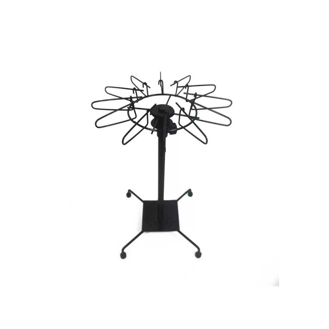 Présentoir de comptoir tourniquet en métal noir. Présentoir à 2 étages réglables en hauteur de 27cm de diamètre avec 12 broches munies d'une tige qui se referme sur elle même (antivol). Hauteur: 70cm.